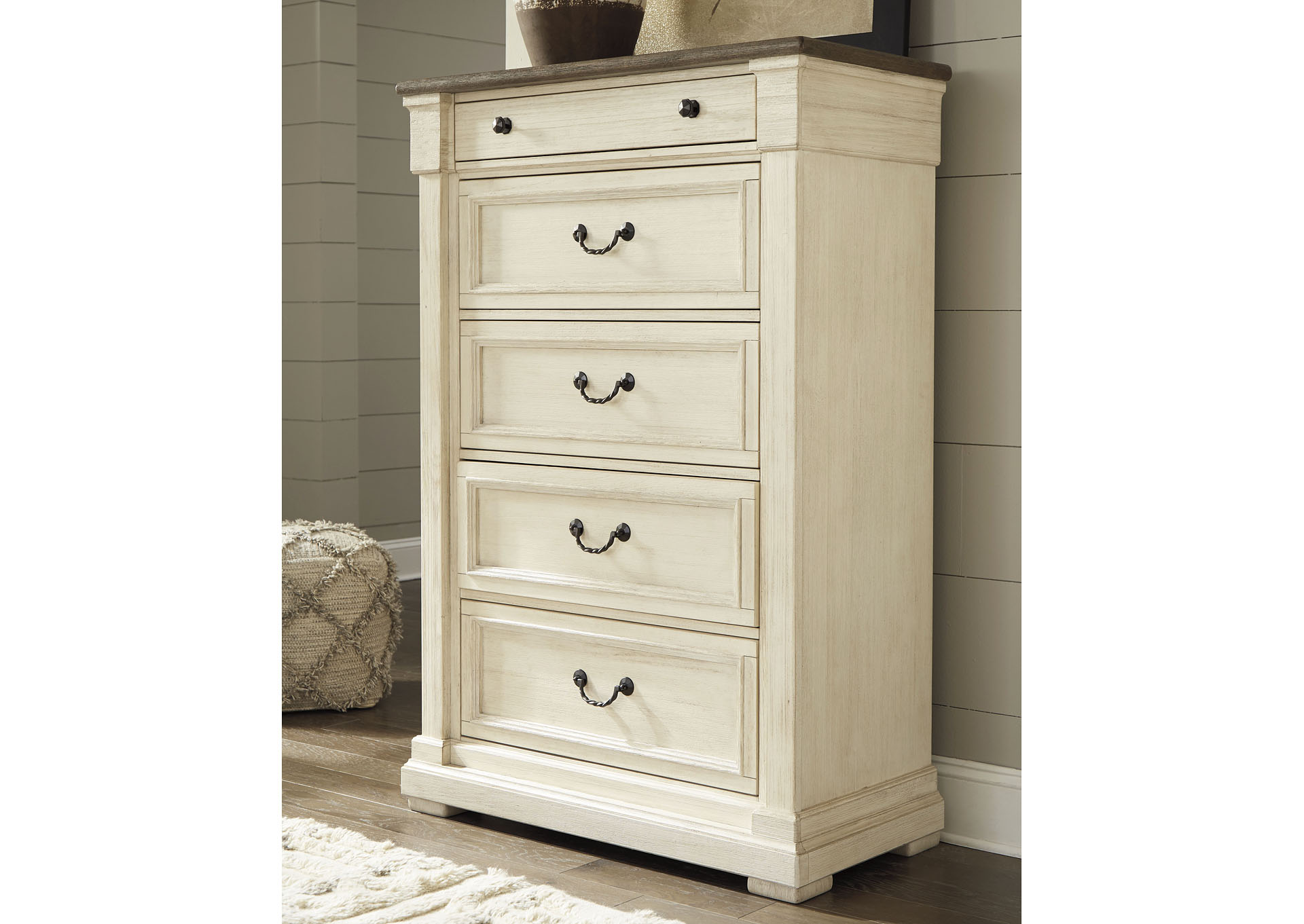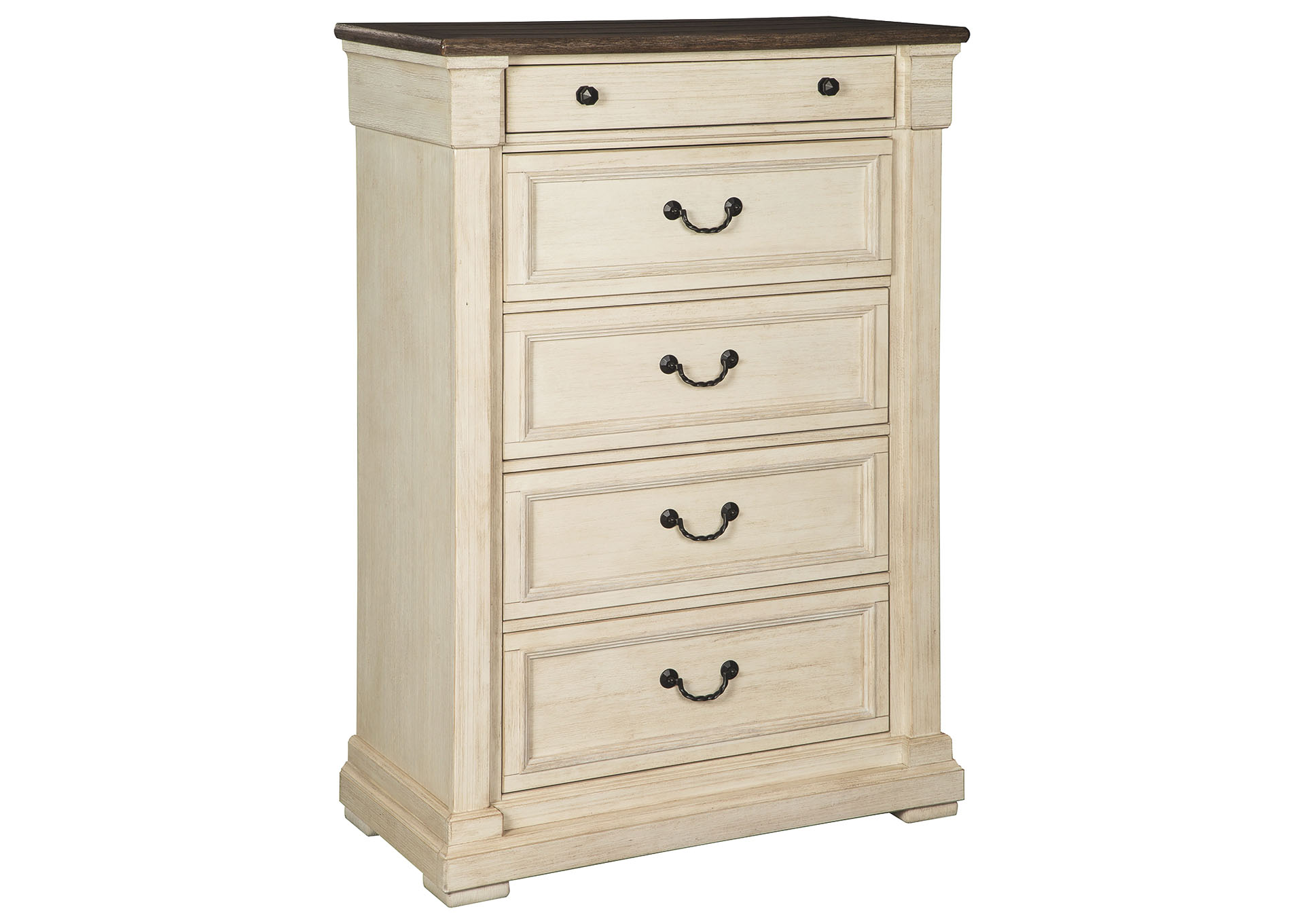 ASHLEY комод BOLANBURG (коллекция AMERICAN LIFESTYLE).Стиль: американский Casual.Тип: комод для спальни высокий, пять ящиков с рамочным фасадом, верхний обит фетром.Цвет: белый/коричневый.Отделка: текстурированная двухцветная; шпон акации; металлическая гранёная фурнитура чёрного цвета.Размеры,мм:ш.1000/г.480/в.1470.