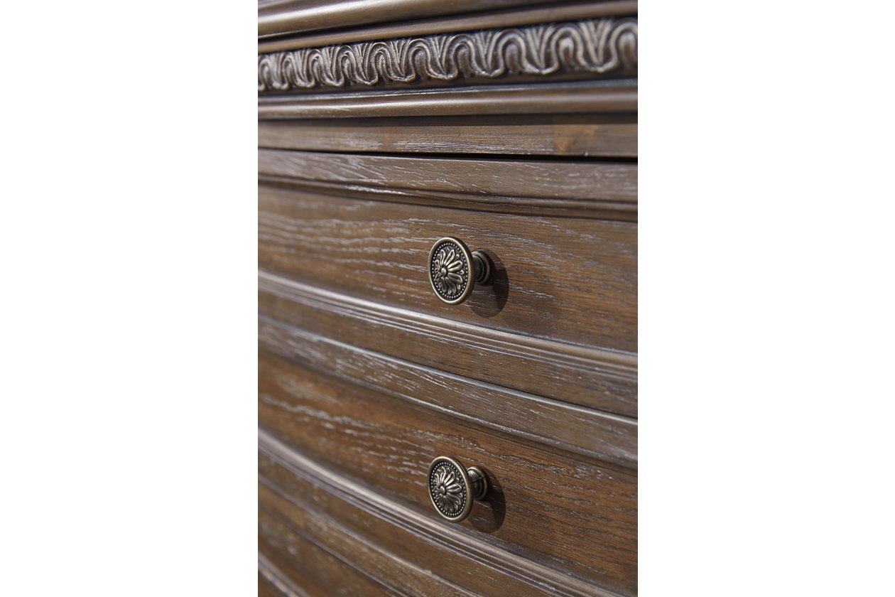 ASHLEY комод CHARMOND (коллекция AMERICAN LIFESTYLE).Стиль: американский Grand Elegance.Тип: комод для спальни широкий,девять ящиков,три верхних обиты фетром.Цвет: коричневый с белыми бликами.Отделка: патинированный шпон дуба,бронзовая фурнитура,декоративные элементы из литой смолы.Размеры,мм:ш.1854/г.508/в.991.
