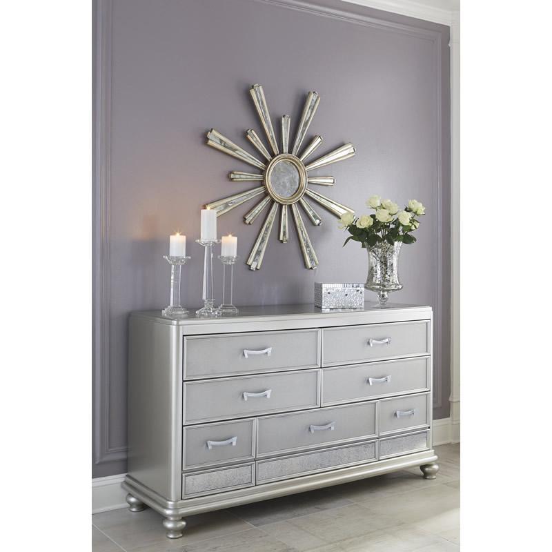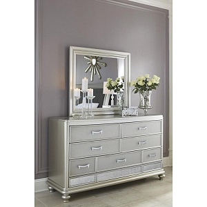 ASHLEY комод CORALAYNE(коллекция AMERICAN LIFESTYLE).Стиль: американский Traditional.Тип: комод для спальни широкий, с семью ящиками,три верхних из них,обиты фетром.Цвет: серебро.Отделка: металлический блеск,зеркальная окантовка,шагреневая текстура фасадов ящиков,хромированная фурнитура украшенная искусственным хрусталем.Размеры,мм:ш.1640/г.480/ш.980.
