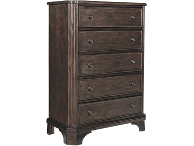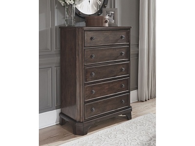 ASHLEY комод ADINTON(коллекция AMERICAN LIFESTYLE).Стиль: американский Traditional.Тип: комод для спальни высокий,с пятью выдвижными ящиками,верхний обит фетром.Цвет: коричневый.Отделка: берёзовый шпон,металлическая фурнитура.Размеры,мм:ш.918/г.445/в.1273.