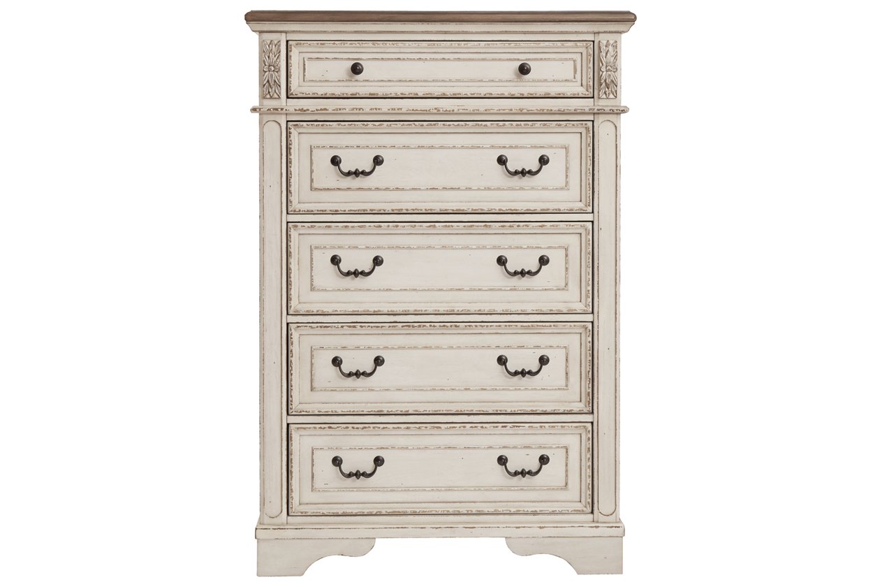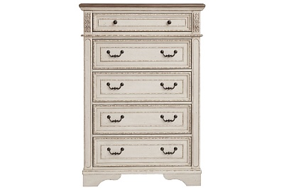 ASHLEY комод REALYN (коллекция AMERICAN LIFESTYLE).Стиль: американский Vintage Casual.Тип: комод для спальни высокий,пять ящиков с рамочным фасадом,верхний обит фетром.Цвет: слоновая кость/коричневый.Отделка: антикварная искусственно состаренная двухцветная;металлическая бронзовая фурнитура.Размеры,мм:ш.1019/г.461/в.1477.