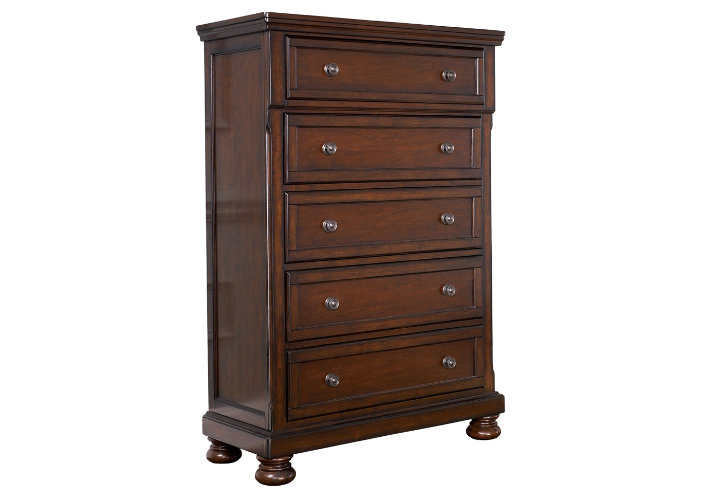 ASHLEY комод PORTER (коллекция AMERICAN LIFESTYLE).Стиль: американский Casual.Тип: комод для спальни высокий, с пятью выдвижными ящиками, верхний с мягкой подкладкой.Цвет: коричневый.Отделка: шпон вишни; инкрустированные панели; антикварная металлическая фурнитура.Размеры,мм,ш.1010/г.457/в.1475.