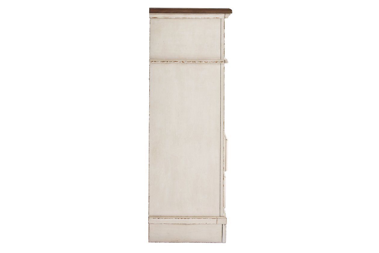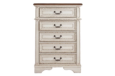 ASHLEY комод REALYN (коллекция AMERICAN LIFESTYLE).Стиль: американский Vintage Casual.Тип: комод для спальни высокий,пять ящиков с рамочным фасадом,верхний обит фетром.Цвет: слоновая кость/коричневый.Отделка: антикварная искусственно состаренная двухцветная;металлическая бронзовая фурнитура.Размеры,мм:ш.864/г.432/в.1226.