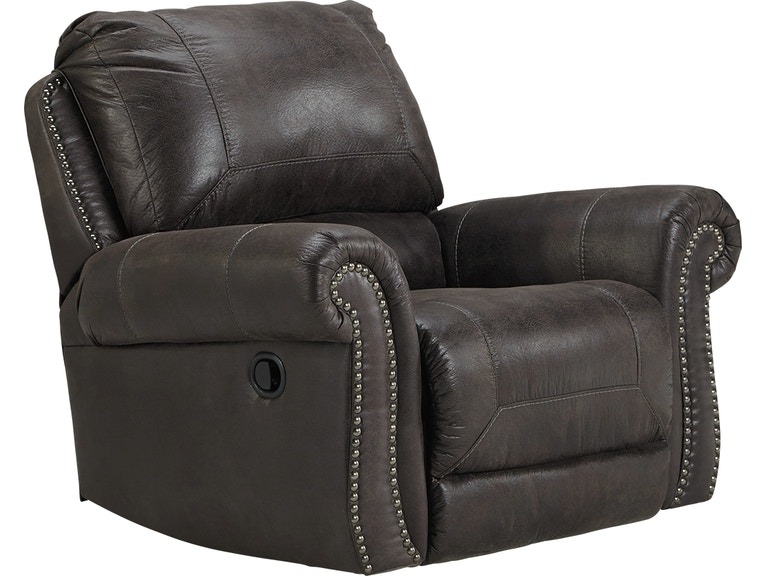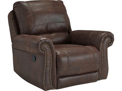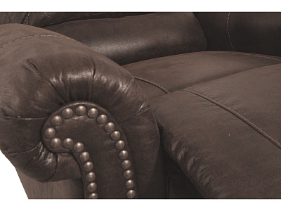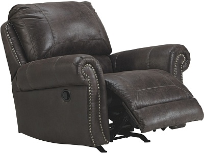 ASHLEY кресло BREVILLE( коллекция AMERICAN LIFESTYLE) .Стиль: американский Vintage Casual .Тип: кресло-качалка реклайнер с механическим приводом.Цвет: доступны: тёмно-серый/коричневый.Обивка: 3% экокожа;97% полиэстер( ткань),категория высшая,одобрена по высоким американским стандартам качества AHFA(износостойкость,долговечность).Отделка:декоративные металлические мебельные гвозди.Размеры,мм:ш.1090/г.1020/в.1020.