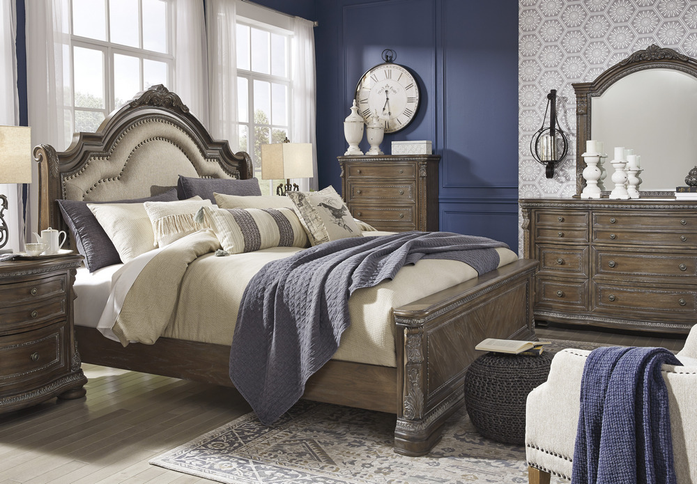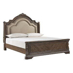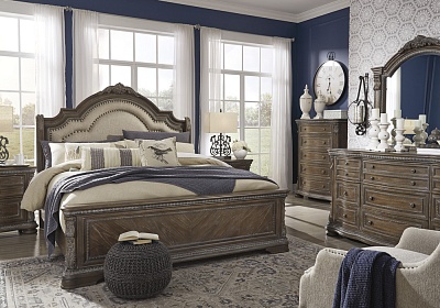 ASHLEY кровать KING/QUEEN SIZE CHARMOND( коллекция AMERICAN LIFESTYLE).Стиль:американский Grand Elegance.Тип:кровать двуспальная,размер спального места,мм: ш.1950/г.2050(KING);ш.1550/г.2050(QUEEN),ортопедическая решётка и матрас в стоимость не входят. Цвет:бежевый,коричневый с белыми бликами.Обивка:изголовье мягкое, сложнофактурная ткань 100% полиэстер,категория высшая,одобрена по высоким американским стандартам качества AHFA(износостойкость,долговечность).Отделка:патинированный шпон дуба,декоративные гвозди,декоративные элементы из литой смолы .Размеры,мм:ш.2134/г.2057/в.1828(KING);ш.1728/г.2057/в.1828(QUEEN).