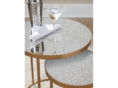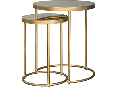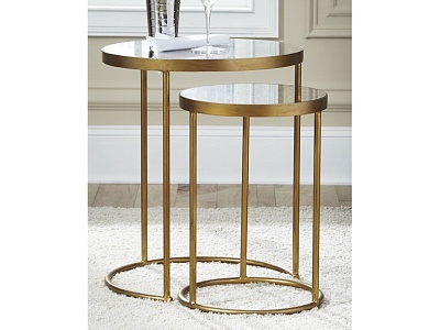 ASHLEY набор MAJACI (коллекция AMERICAN LIFESTYLE).Стиль: американский Modern.Тип: набор из двух круглых приставных столов с зеркальными столешницами.Цвет: золотой.Отделка: античное золото .Размеры,мм: высокий(ш.502/г.502/в.610)/низкий(ш.349/г.349/в.519).