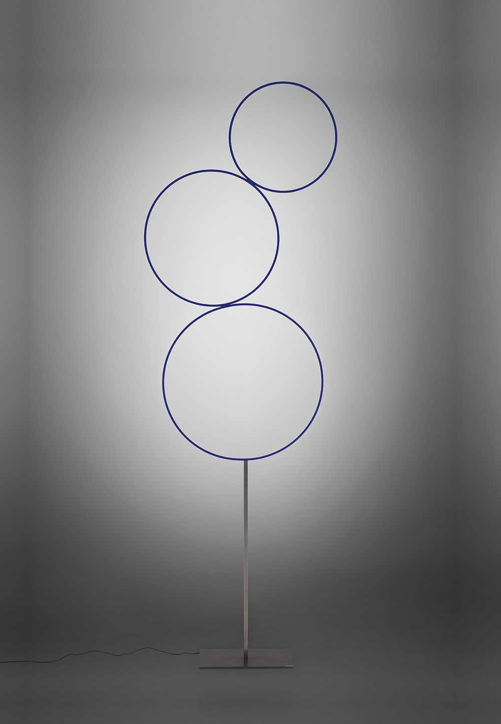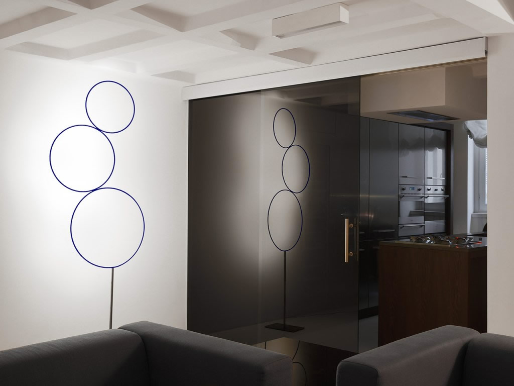 Sorry Giotto 3 – необычные светодиодный торшер состоит из трех медных кругов, разрисованных вручную синим цветом. Внушительная световая скульптура из тонких линий очаровывает своей простотой. Светодиоды скрыты внутри. Такой светильник с теплым светом прекрасно дополнит современный интерьер.