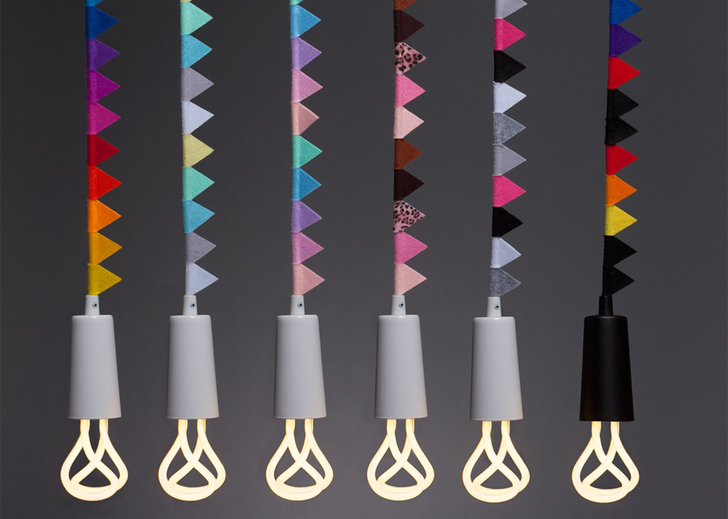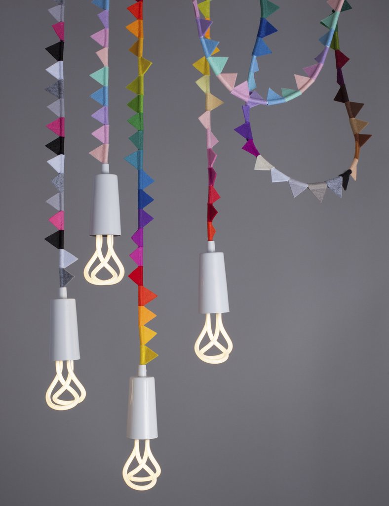 Классическая модель Plumen, Drop Cap – минималистичный подвесной светильник с энергосберегающей лампой, состоящей из причудливо завитых трубок – теперь выпускается в ярком и жизнерадостном варианте, украшенном разноцветными флажками.