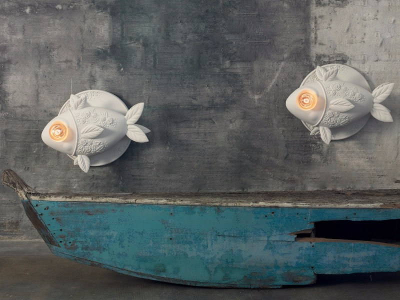 Aprile – настенный светильник необычного вида. Большая белая рыба из керамики, украшенная растительными элементами – листьями вместо плавников и цветами вместо чешуи. Такой светильник всегда будет ярким акцентом в интерьере, посвященном минимализму.
