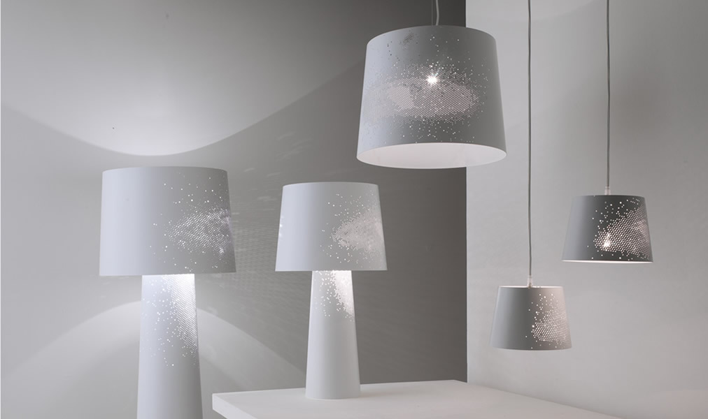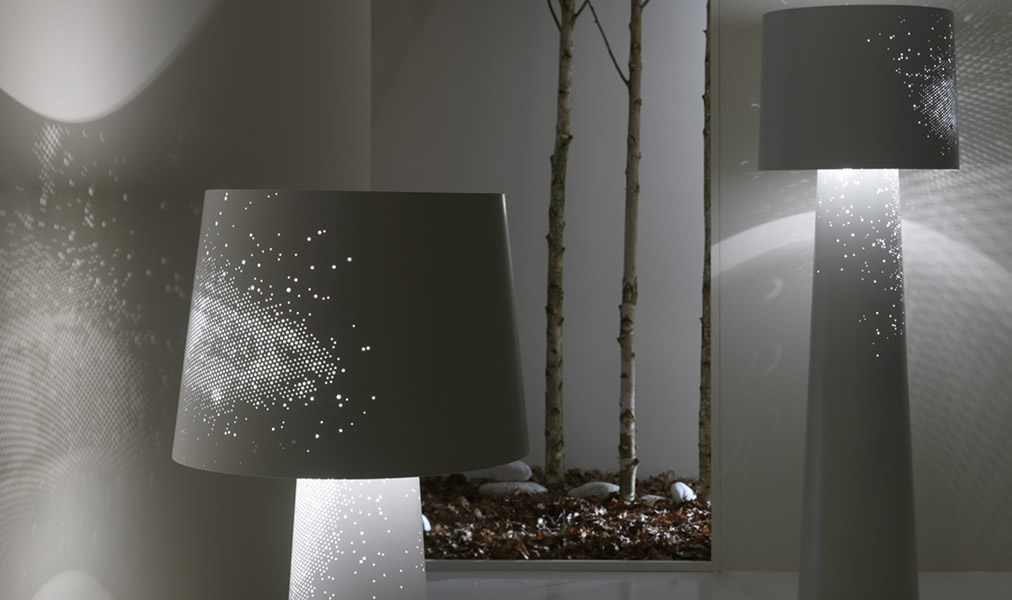 Sky – напольные светильники из тонкого лакированного металла создают неповторимую обстановку вокруг, отбрасывая на стены свет сотен звезд. Коллекция состоит из напольных, настольных и подвесных светильников.