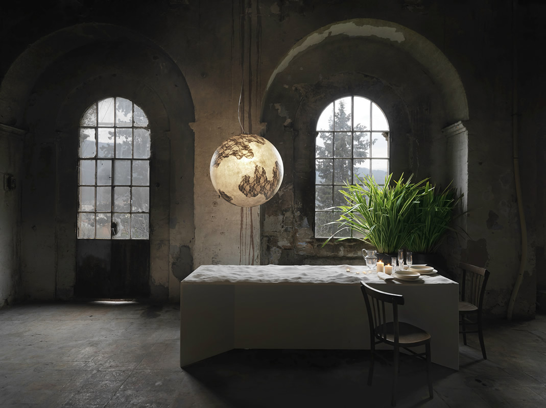 Ululi-Ulula – это ваша персональная луна, наполняющая романтикой и чувственностью окружающий интерьер. Подвесной светильник в виде идеального шара изготовлен из окрашенного стекловолокна, на выбор белый или серый цвет. Коллекция состоит из подвесных, напольных и настольных светильников разного размера.
