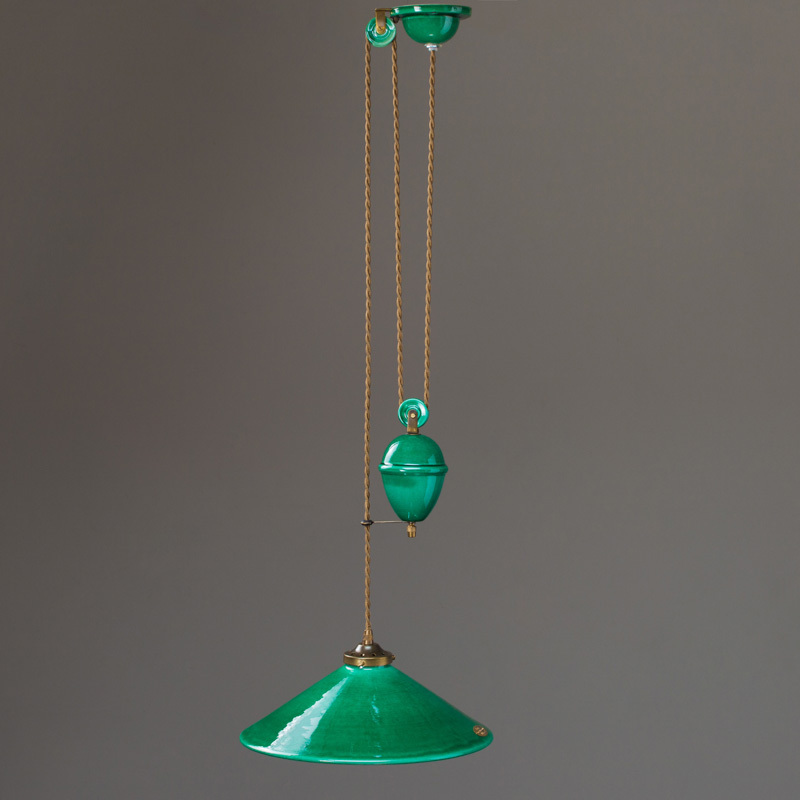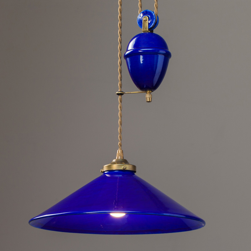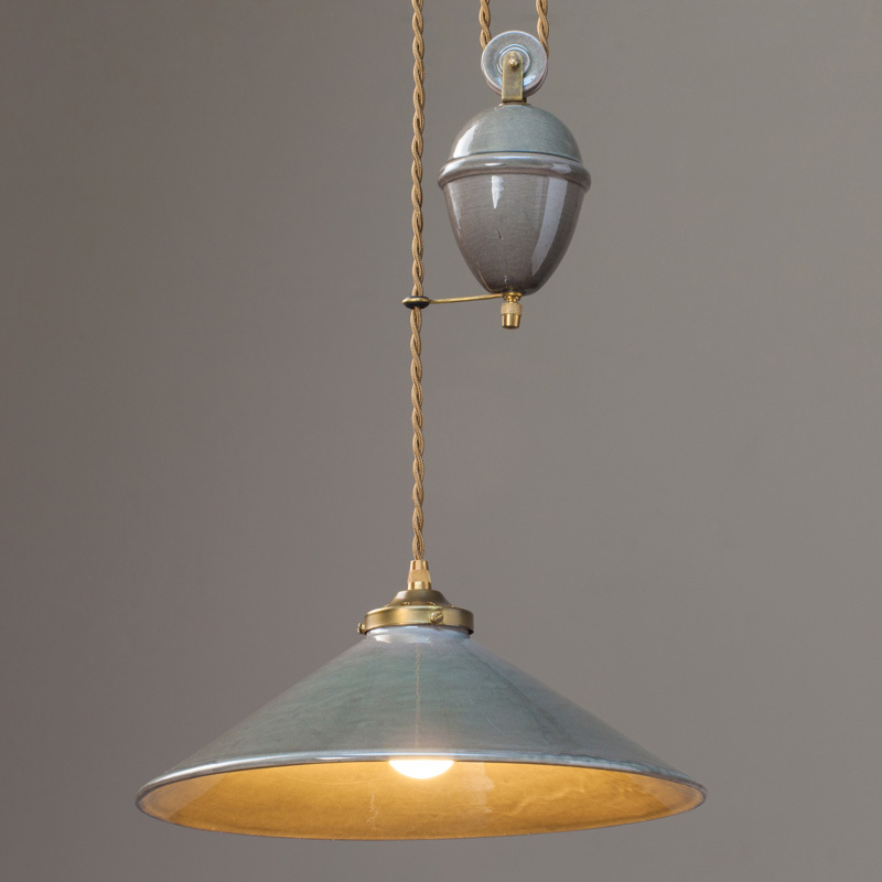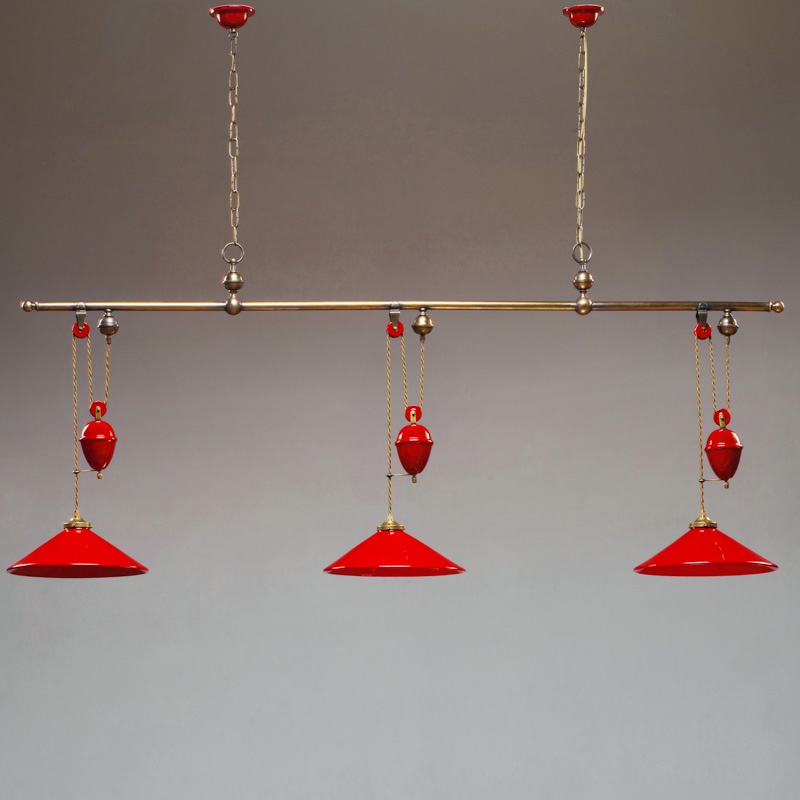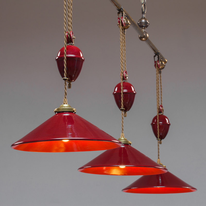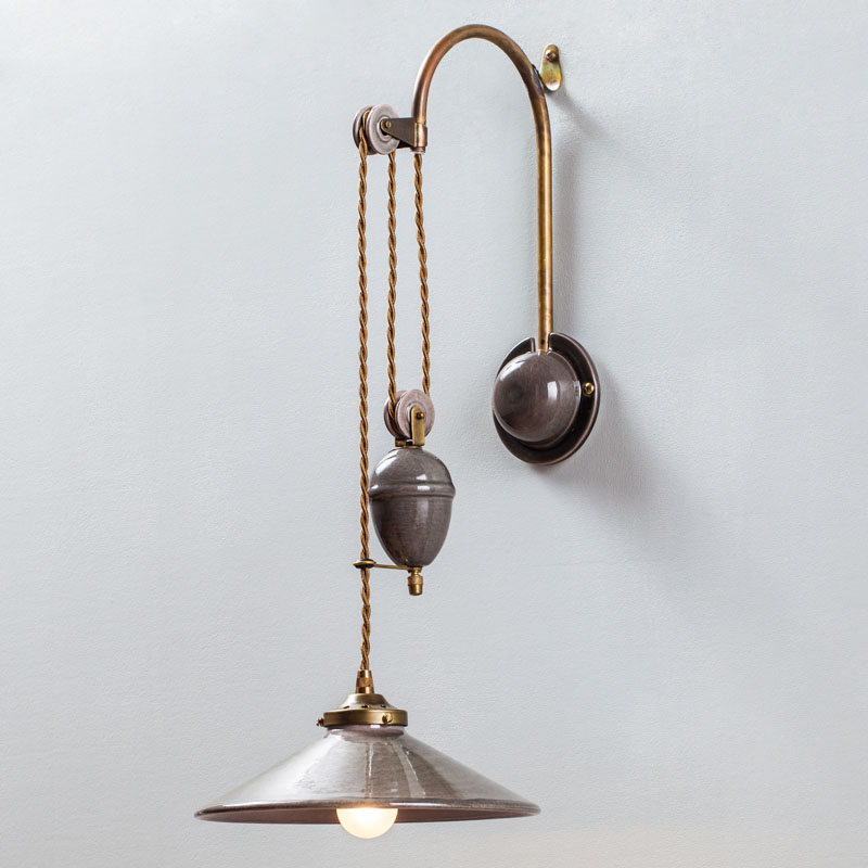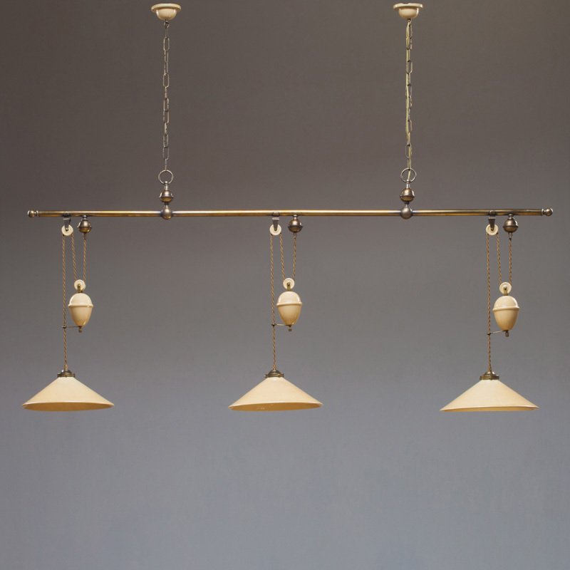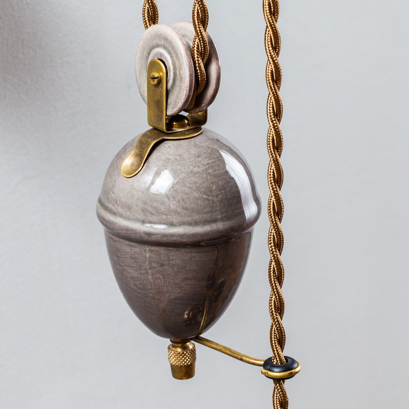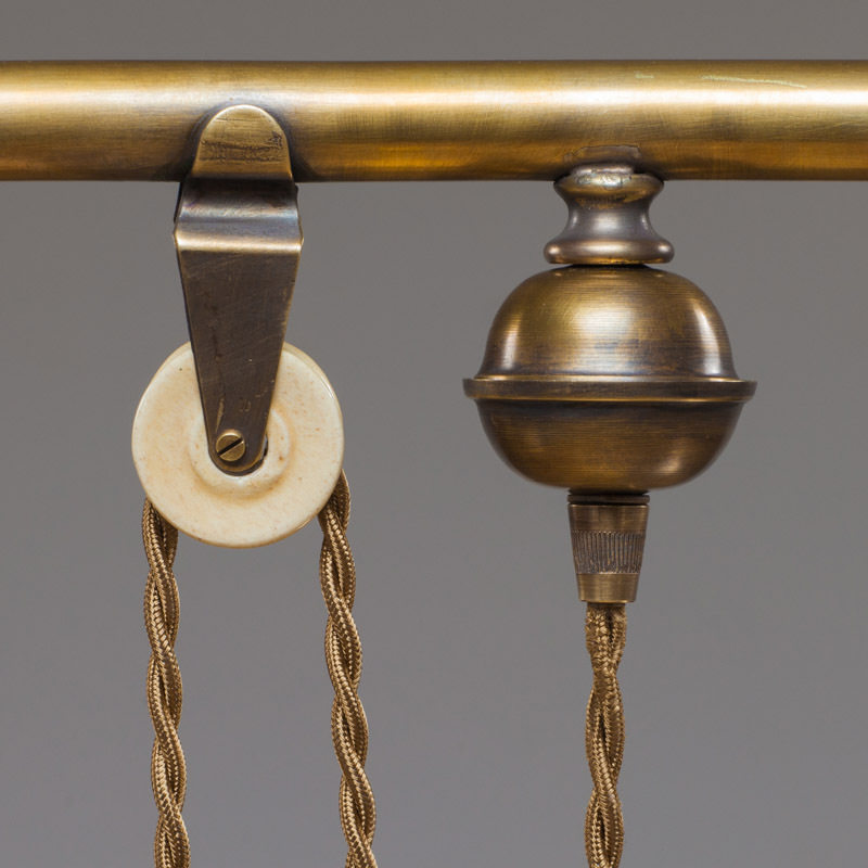 Металлические части светильников изготовлены из латуни. Вся электрика абсолютно современна и функциональна. Регулировать высоту абажура позволяет противовес, который закреплен на проводе и наполнен ружейной дробью.