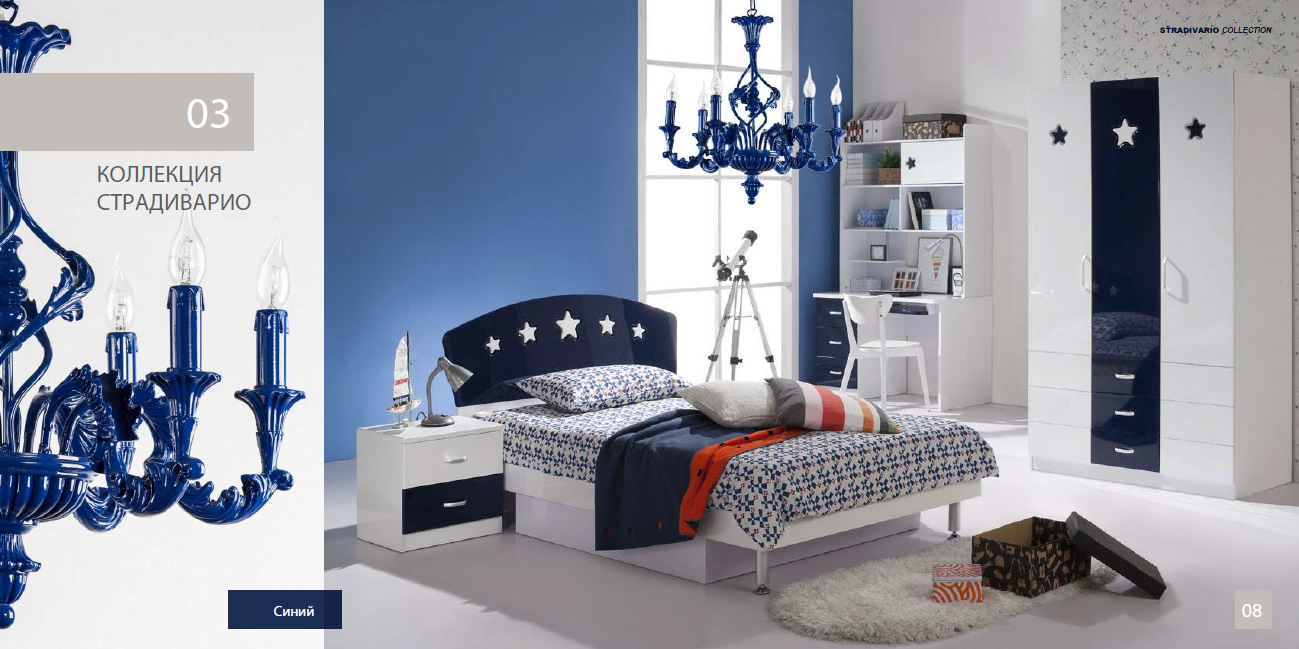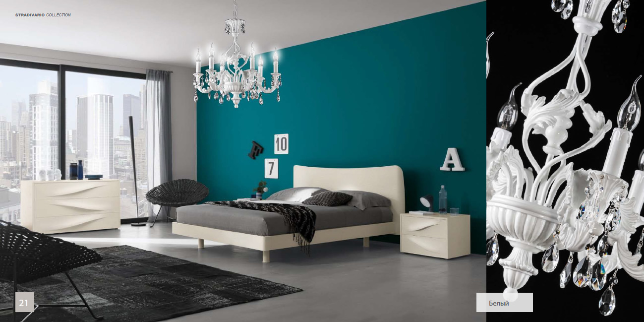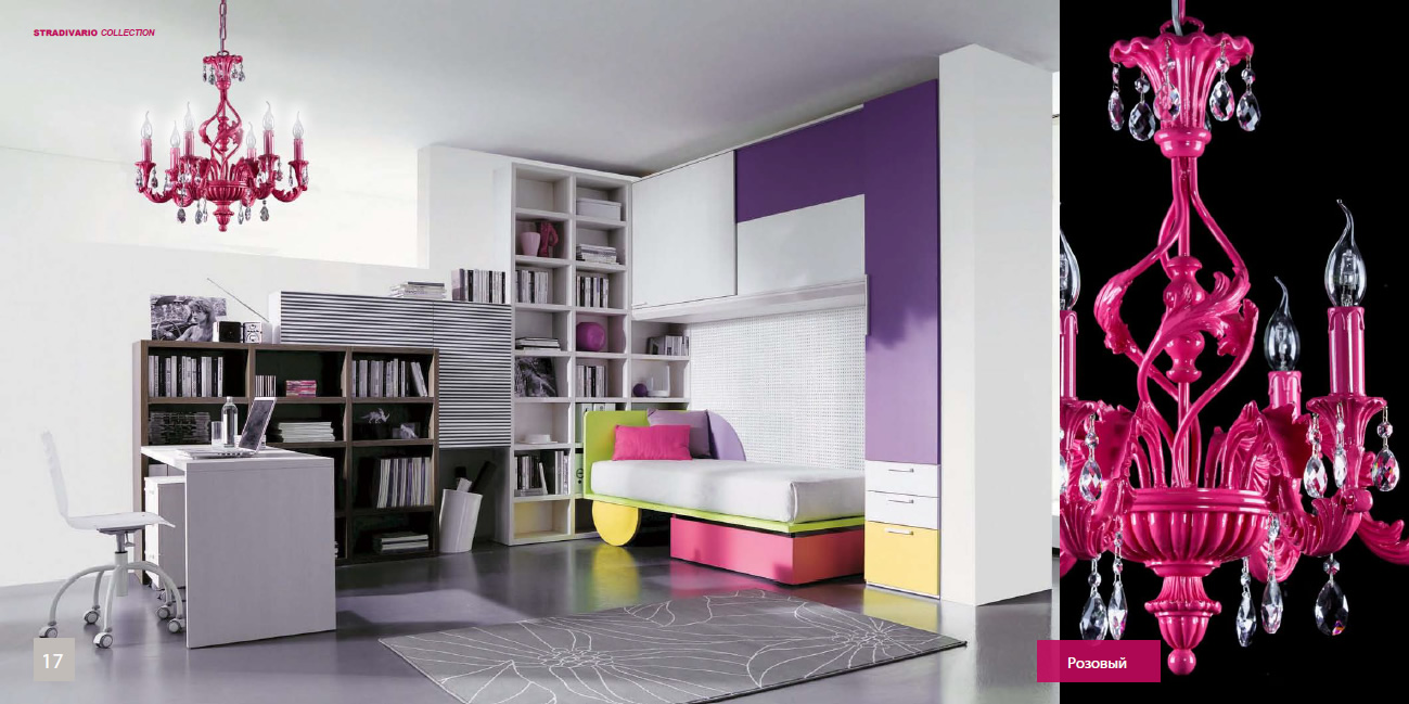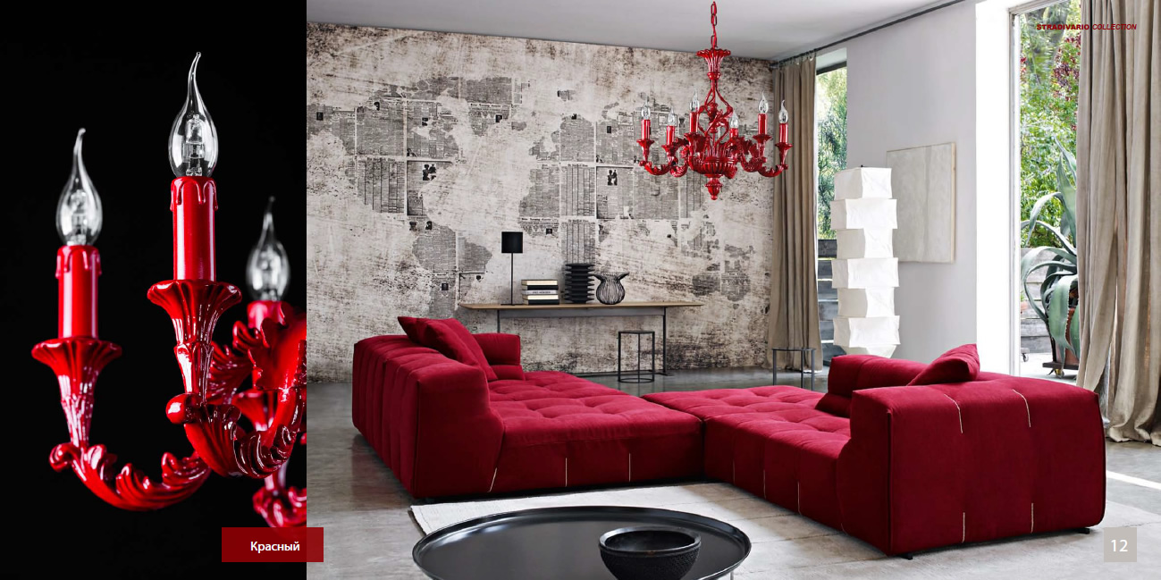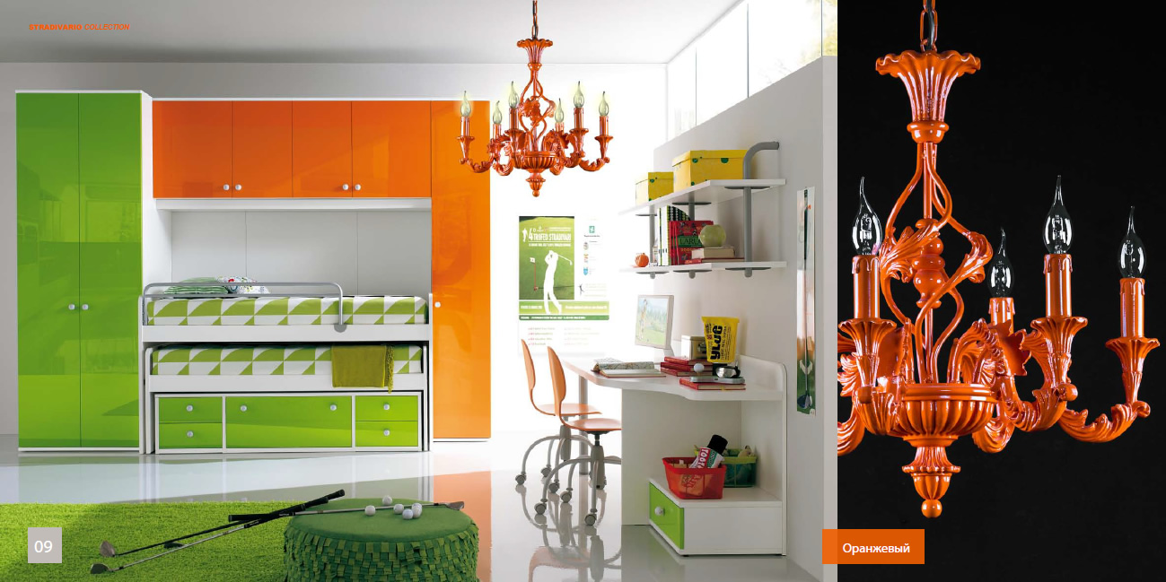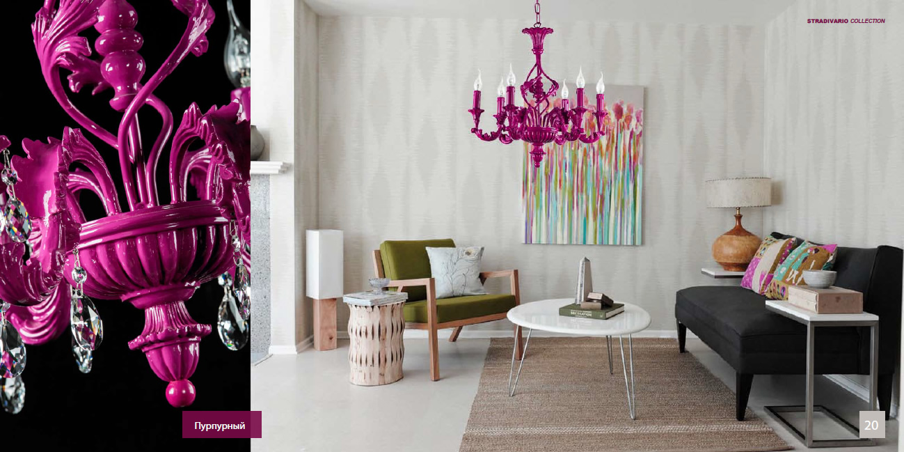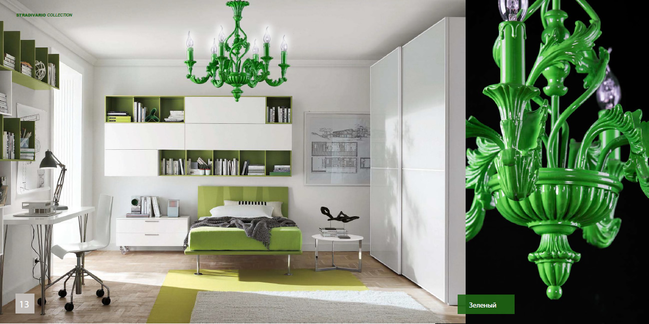 Стандартными цветами коллекции являются: синий, оранжевый, красный, зеленый, фиолетовый, розовый, пурпурный, белый, черный, серебряный, золотой и декапе с оттенком золотого. В нашем салоне можно приобрести люстры белого цвета.