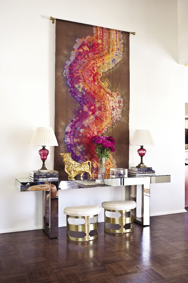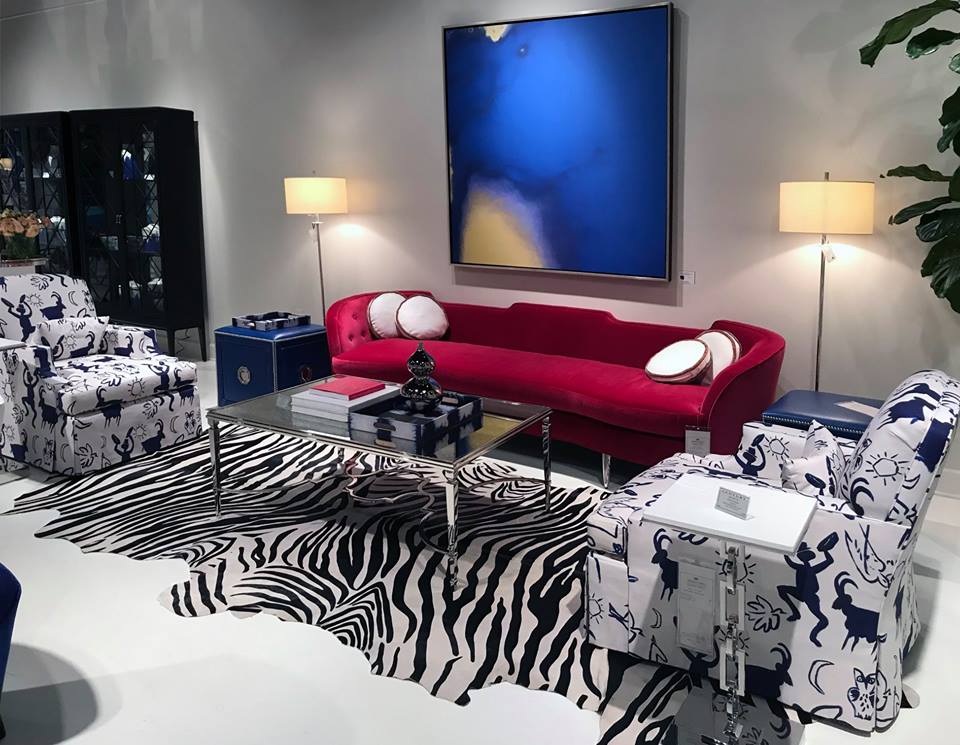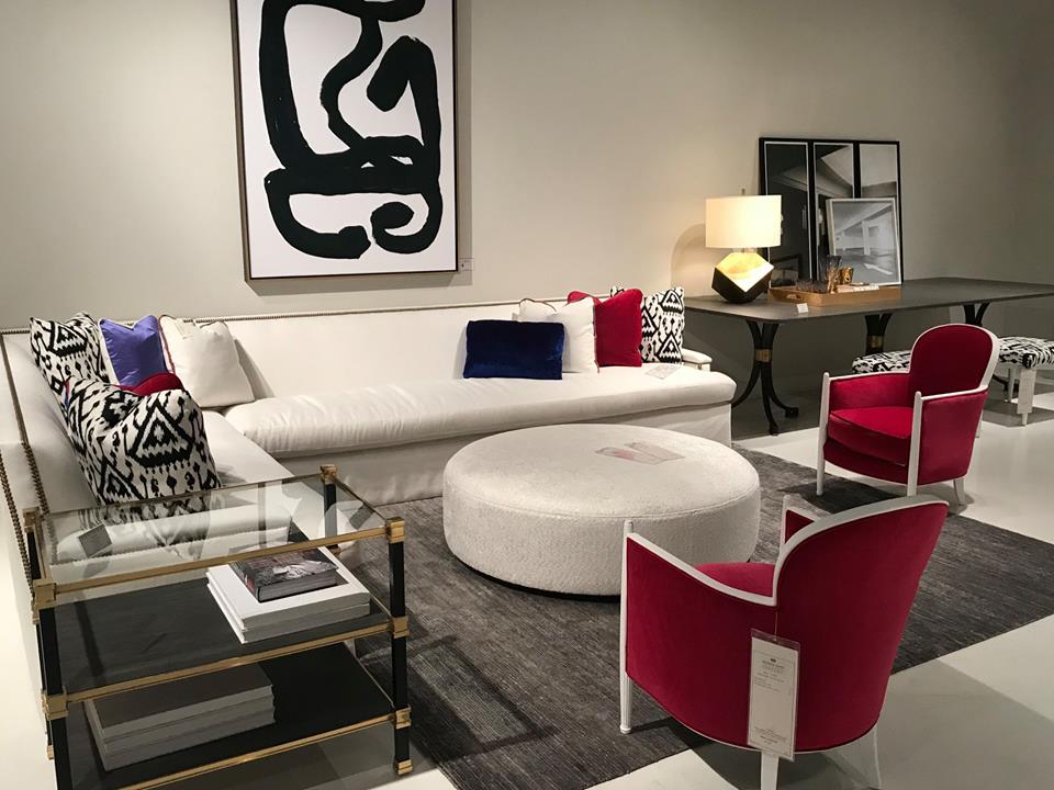 Коллекция Thomas O'Brien неординарная, новые предметы хороши. Очень эффектно смотрелась входная зона, подготовленная внутренним отделом дизайна Century. В этой входной группе, которая привлекает внимание - совсем небольшие размеры. Глядя на этот красный диван, не скажешь, что это американцы. Невысокая спинка, пластичные формы - типично европейский предмет. Графичное контрастное решение, черное с белым - коврик-зебра на полу.