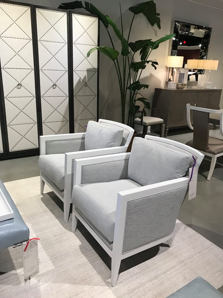 У многих, и у Century, как видно на фото, появились любопытные модернистские формы ножек, словно собранные из кубиков разного размера. Модная штука. Второе, что бросается в глаза - многие начали вшивать в обивки акценты другого цвета. Стул белый, а посередине синяя полоска. Или спинка другого цвета. Белая кровать, отороченная темным графичным контуром. Такое решение часто применялось в этом году. Что интересно, эта графичность часто достигаются с белым акцентом, а не с черным. Обычно для графических решений выбирают черный акцент, а здесь белый цвет, чем он и понравился. Графика появляется, когда весь контур предмета полностью закрыт деревянным каркасом, а ткань находится внутри. Кресло с открытыми подлокотниками - типично американская история. Такое кресло есть у многих, но стыки, сочленения далеки от идеала. А этот предмет от Century идеален.