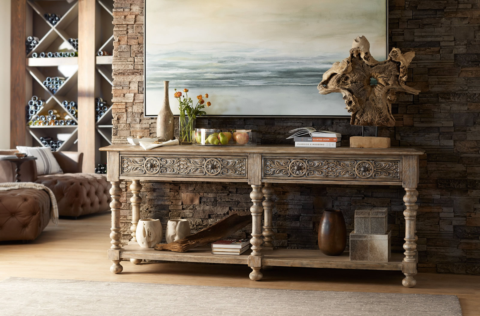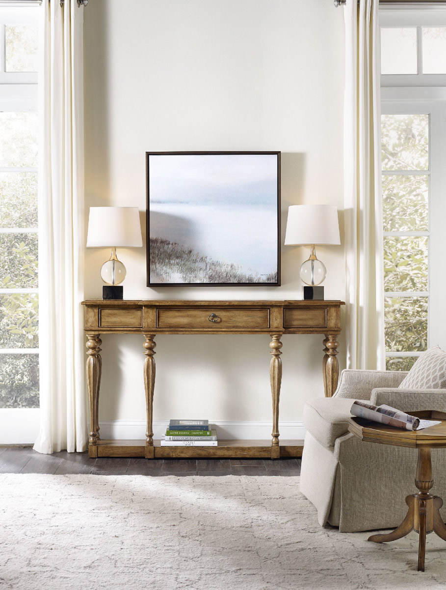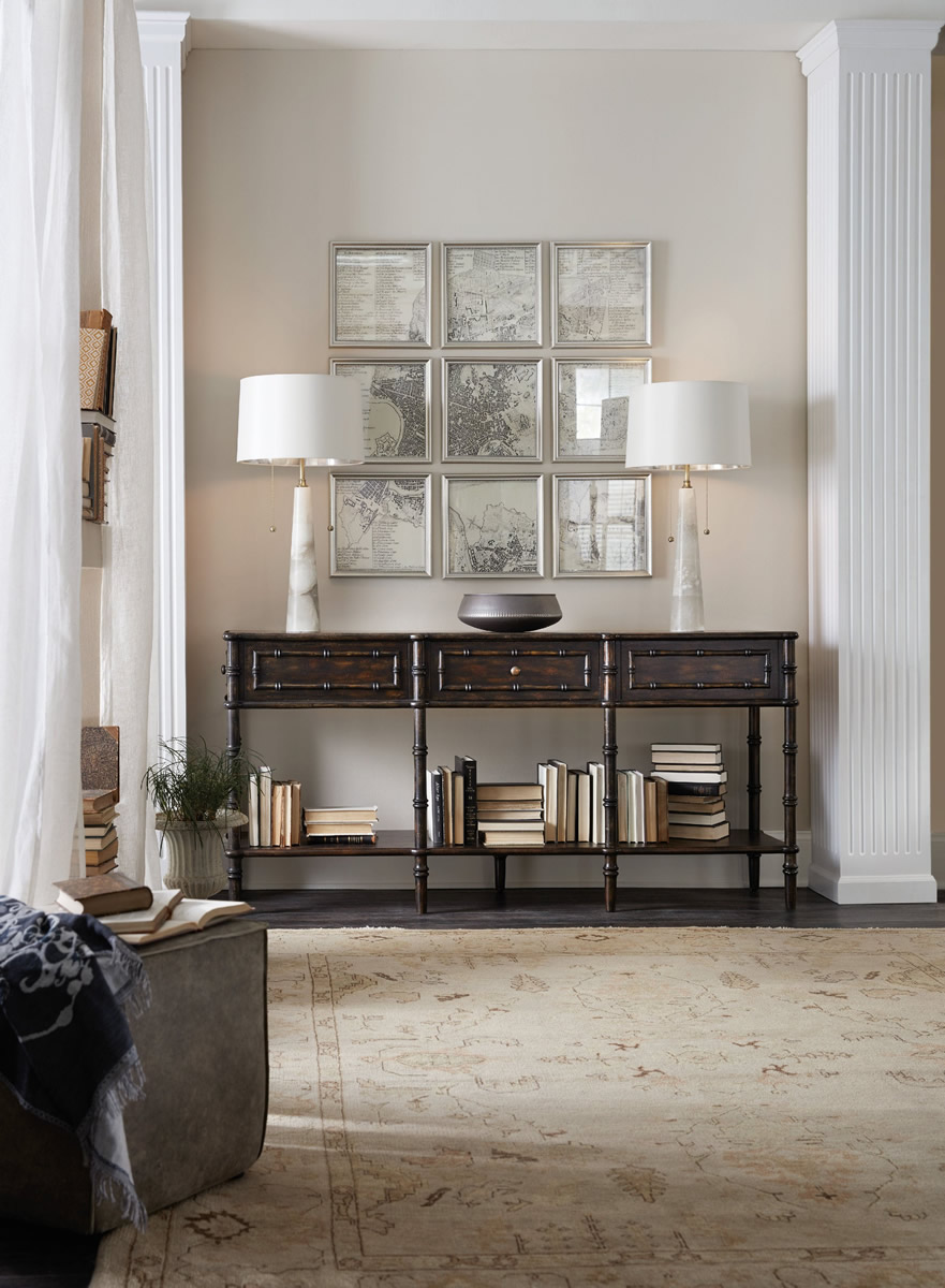 При свободном расположении мебели в гостиной — это может быть планировка студио или просто стоящий посредине комнаты диван, вполне возможно позади задней стенки поставить консоль. На ней может быть удобно хранить вещи, которыми вы пользуйтесь в этой зоне. Это могут быть недочитанные книги, мобильный телефон, планшет, здесь удобно также располагать поднос с продуктами или даже элементы домашнего бара — графин и красивые стаканы. Поставьте на консоль несколько красивых рамок с фото, настольную лампу или другие элементы декора — это разнообразит наполнение и придаст особый шарм интерьеру.