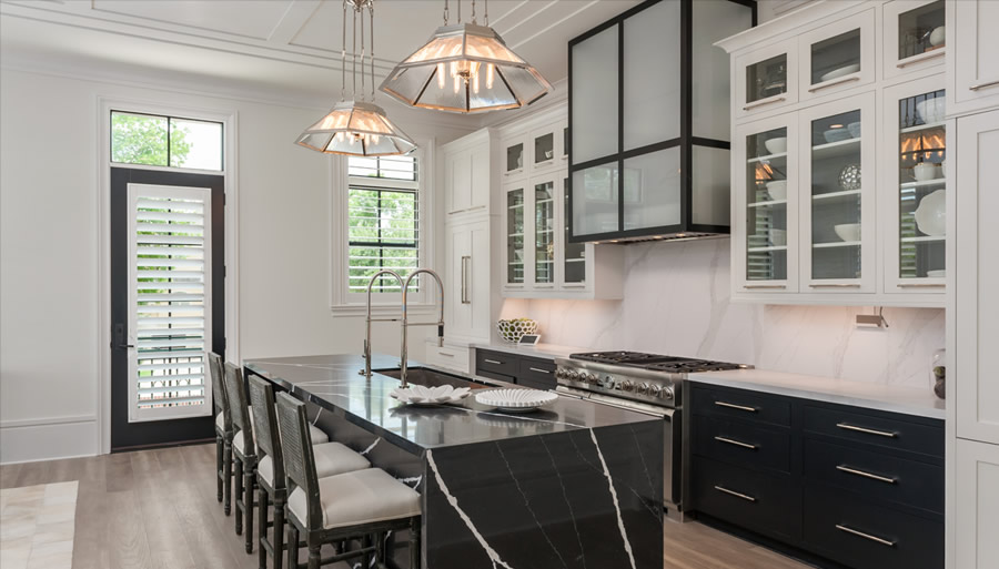 Крупнозернистый мрамор на портале большого камина и роскошный текстиль в гостиной демонстрируют красоту разнообразных текстур. Люстра Cleo Large Chandelier и настольные лампы Linden Table Lamps в кастомизированной отделке из коллекции Kelly Wearstler создают игривый контраст своими смелыми геометрическими формами. Люстра ассиметричной формы Fontaine Vertical Chandelier из коллекции AERIN служит стильным центральным элементом элегантной столовой. Яркая эстетика кухни в монохромной гамме. Пара подвесных светильников из коллекции Ralph Lauren освещает черный мрамор кухонного острова, превращая это место в настоящее сердце дома.
