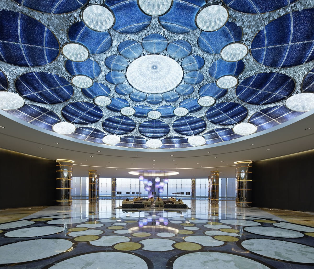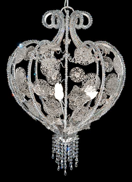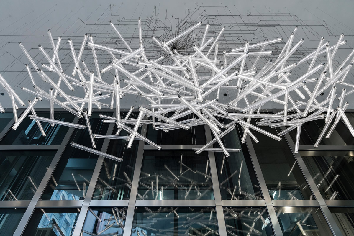 Парящее над потолком невесомое полотно – именно так выглядит артефакт Тани Дворяковой (Táňa Dvořáková) Twill в интерьерах отеля Shangri-La Jing An в Шанхае. На самом деле драгоценная материя соткана из множества скрепленных между собой мелких хрустальных шариков. Маурицио Галанте (Maurizio Galante) развил эту тему, выразив через стекло мягкость и тонкость трепещущего шелка в своём Plisse Cloud.